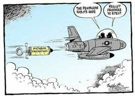 This cartoon by Bob Englehart and the Hartford Courant depicts trust issues. In contrast to this illustration, many Service-members continued to serve their nation, despite refusing the vaccine, highlighting the inequities imposed on other troops that were jailed, demoted, fined and discharged less than honorably.